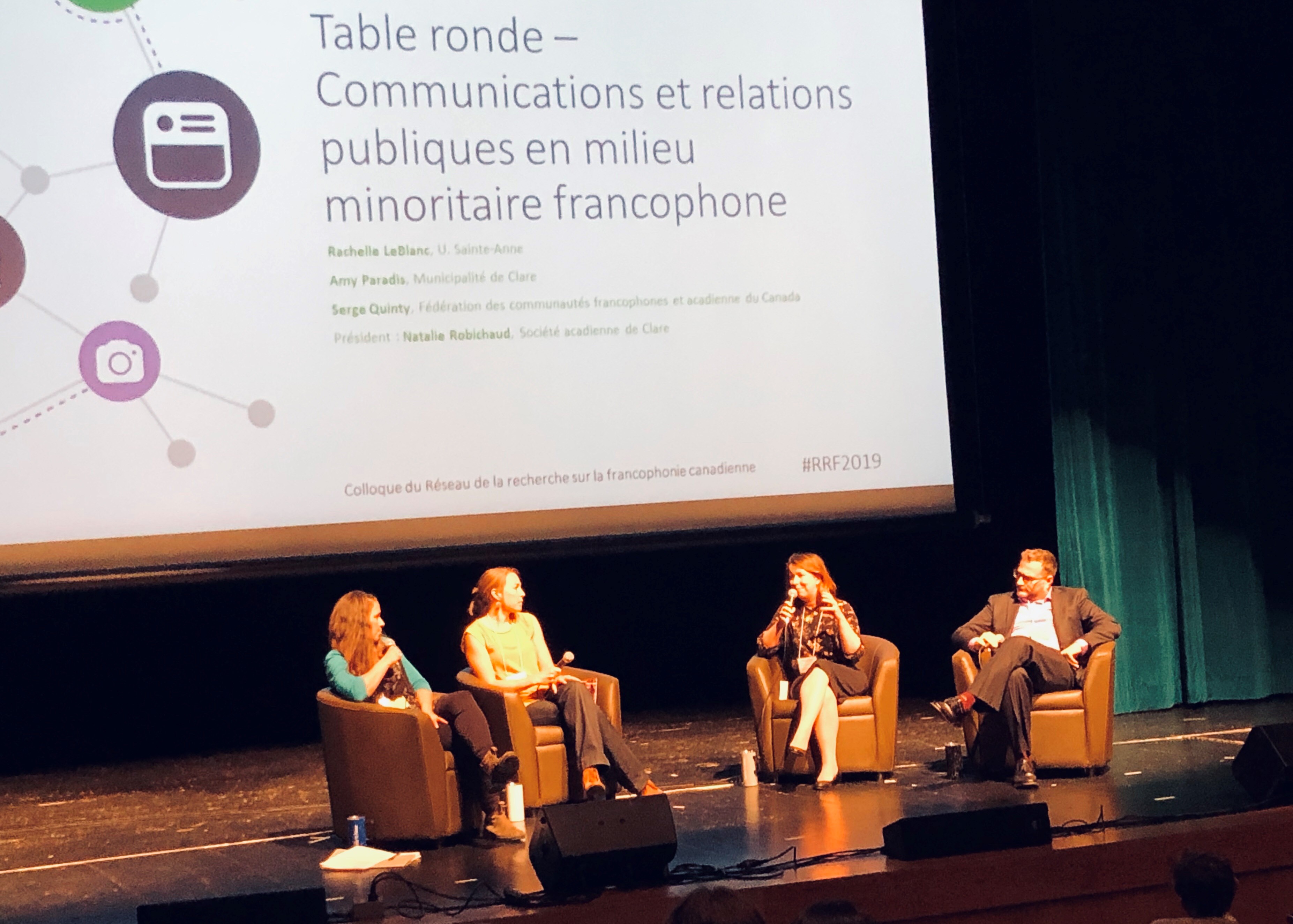 Ajoutons que Rachelle LeBlanc, Directrice des communications et du marketing de l'Université Sainte-Anne, a participé à une table ronde intitulée « Communications et relations publiques en milieu minoritaire francophone », animée par Natalie Robichaud, directrice générale de la SAC et étudiante à la Maîtrise ès arts en cultures et espaces francophones, alors que Maëva Touzeau, une ancienne de Sainte-Anne et docteure en littérature et sciences du langage de l’Université d’Angers, présenta, dans une communication intitulée « Les ‘relèves artistiques et littéraires’ sur la Toile », une partie des recherches qu’elle a menées dans le cadre de sa résidence postdoctorale à Sainte-Anne (directeur, Jimmy Thibault). | | Natalie Robichaud, Rachelle LeBlanc, Amy Paradis et Serge Quinty discutent lors d'une des tables rondes du colloque sur les médias.