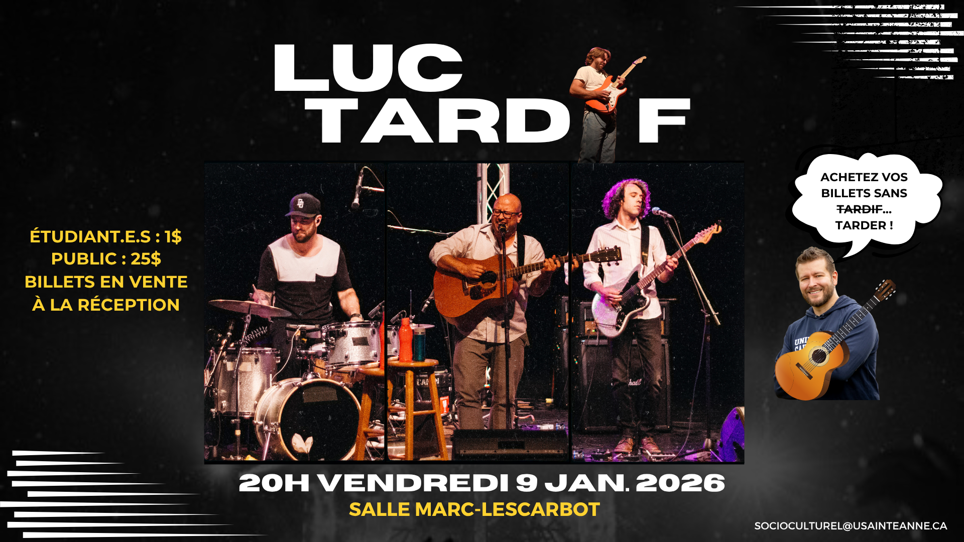 Luc Tardif, c’est de la musique, de l’humour, de l'amour et une présence attachante sur scène. Ne manquez pas cette soirée unique — un spectacle rempli de talent et de bonne humeur.