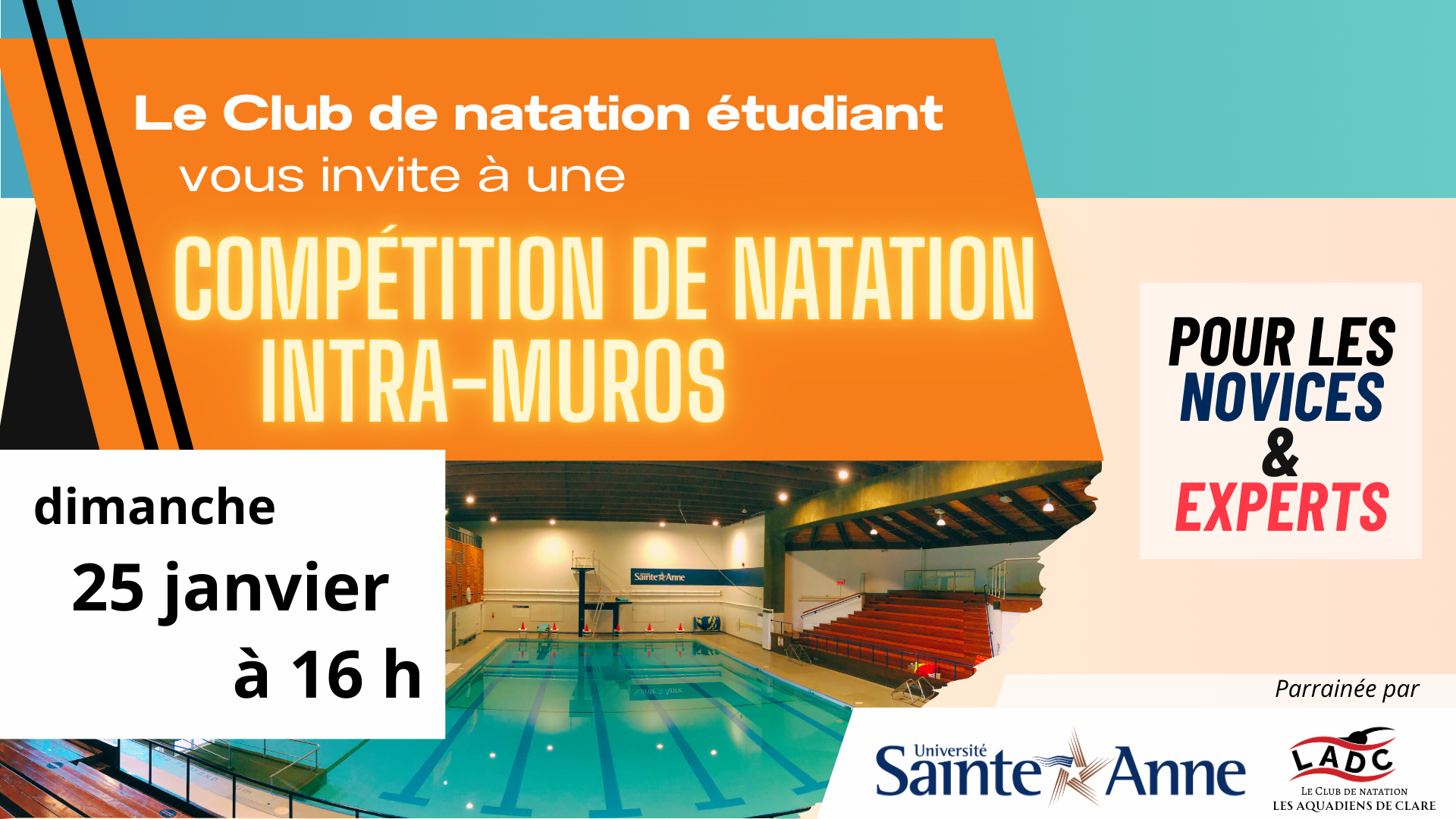Ce dimanche 25 janvier, le Club de natation étudiant de l’Université Sainte-Anne, avec l’appui du Club de natation Les Aquadiens de Clare, lance une compétition de natation intra-muros. Les novices et les experts, tous sont les bienvenus !