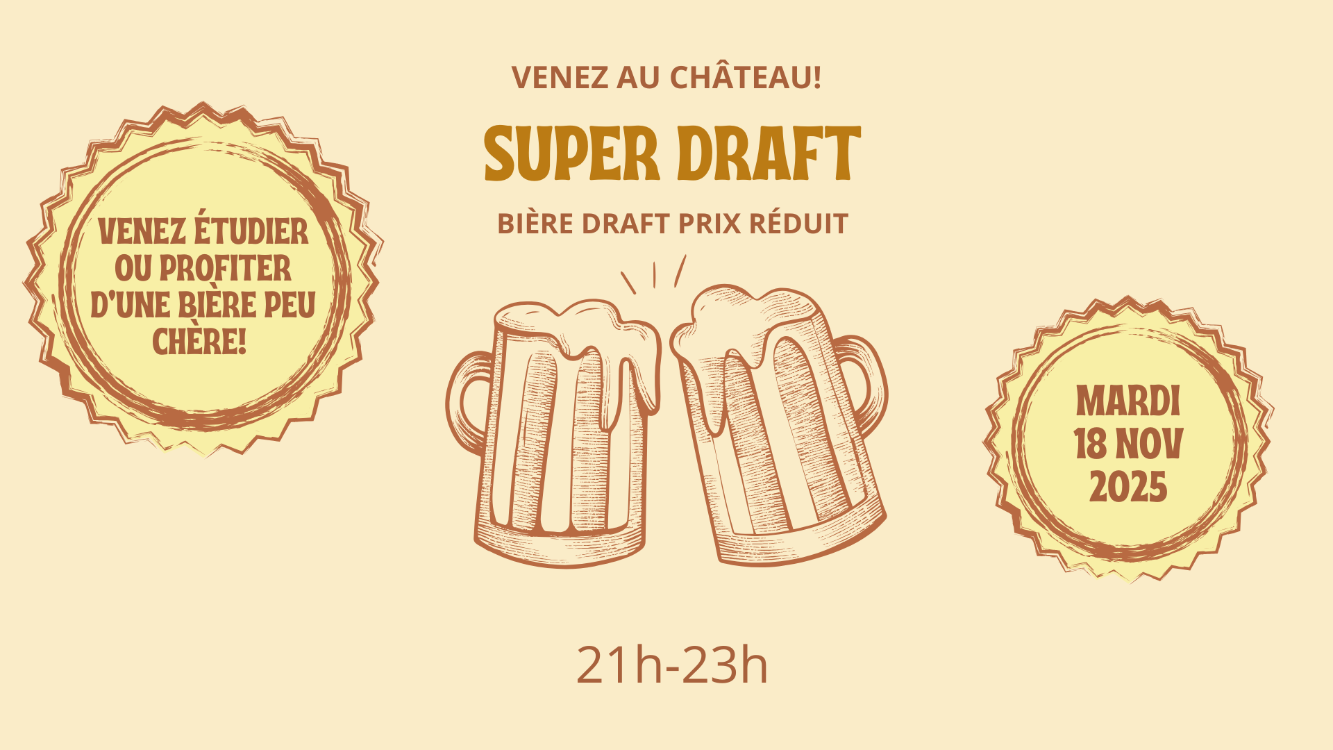Venez acheter une bière Draft à prix réduit au château et profiter d’une ambiance détente pour étudier ou passer un bon moment entre amis.