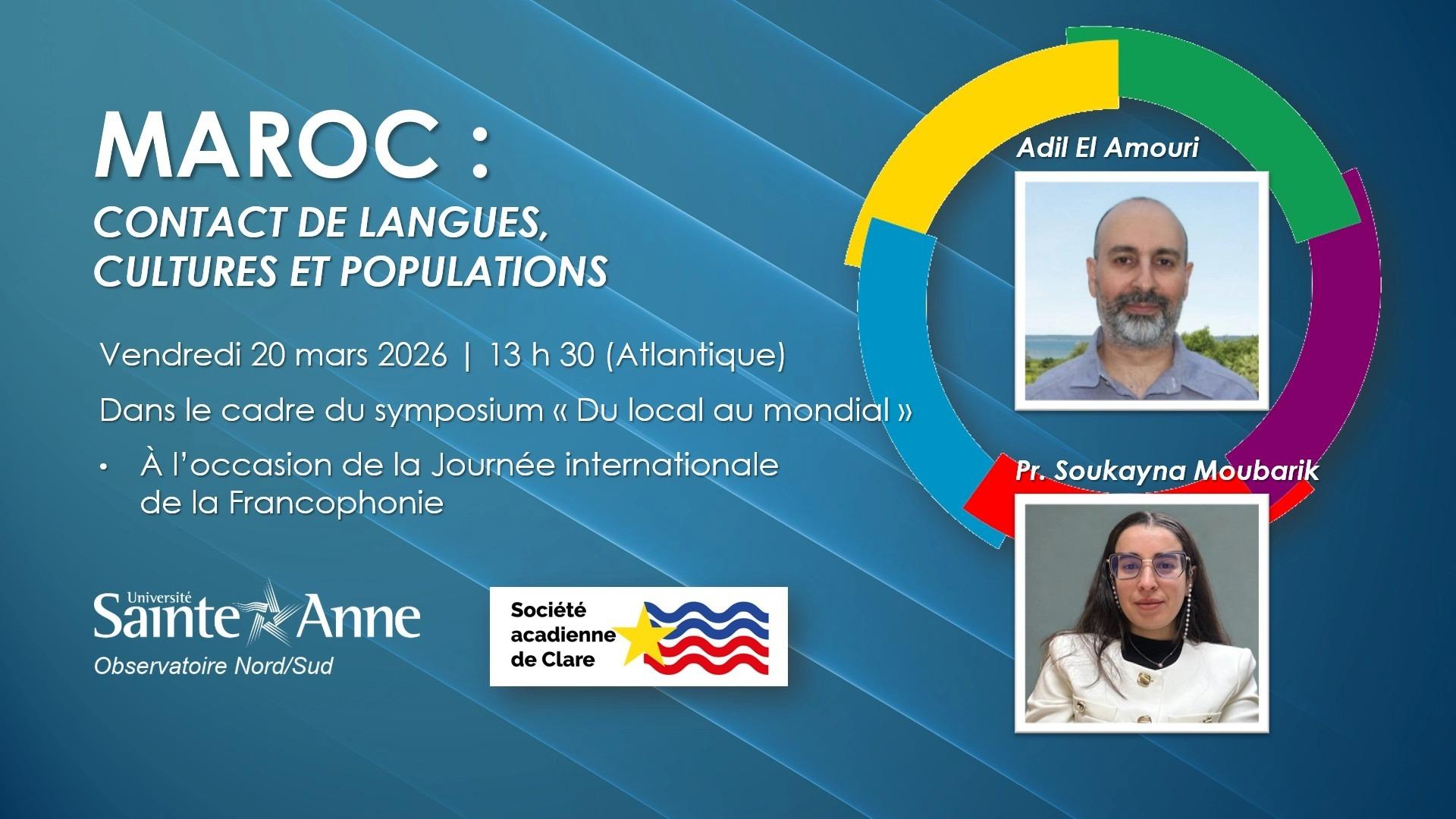 OÙ : Observatoire Nord/Sud de l’Université Sainte-Anne (2e étage de la Bibliothèque Louis-R.-Comeau) et Microsoft Teams.