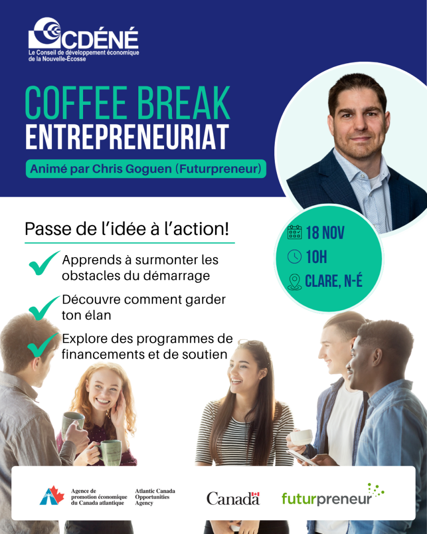 Le Conseil de développement économique de la Nouvelle-Écosse (CDÉNÉ), en collaboration avec Futurpreneur — un organisme national qui accompagne les jeunes entrepreneurs (18 à 39 ans) — vous invite à une pause-café entrepreneuriale.