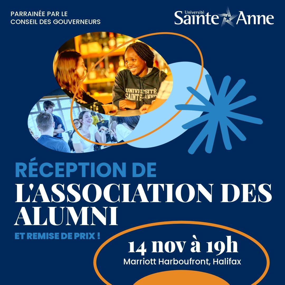 La réception aura lieu le vendredi 14 novembre 2025 à 19h au Marriott Harbourfront à Halifax (1919 Upper Water Street). Ce sera également l’occasion de reconnaitre les lauréates et lauréats des Prix Alumni de l’année et Étoile filante.