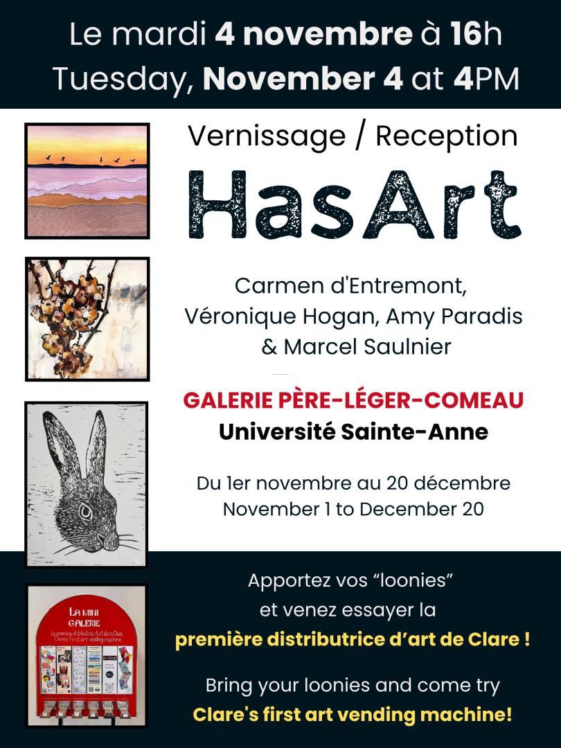 Le 4 novembre de 16 h à 18 h à la Galerie Père-Léger-Comeau, assistez au vernissage de HasArt, une exposition présentant les œuvres des artistes du Conseil des arts de la Baie Carmen d’Entremont, Amy Paradis et Marcel Saulnier, ainsi qu’une machine distributrice d’art, propriété de l’artiste Véronique Hogan. HasArt a pris forme dans un véritable tourbillon de créativité, offrant un regard vibrant et familier sur Clare, à travers des œuvres en papier déchiré, des linogravures et des peintures inspirées de la nature et du patrimoine local. L’exposition marque aussi le lancement de La mini galerie, première machine distributrice d’art en Clare. Cette initiative originale et accessible permet au public de découvrir, collectionner et soutenir les artistes de chez nous.